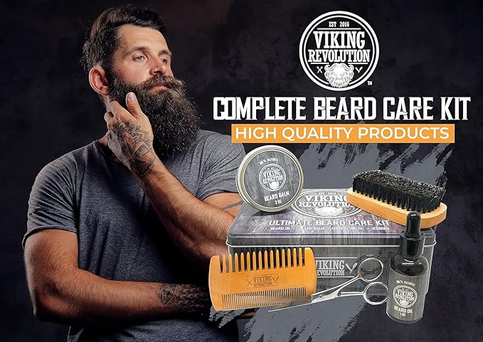 - Perfect Holiday Gift For Men - Viking Revolution Beard Kit for men is what your man needs to look smoking hot this holiday! This ultimate beard care kit contains Wooden Boars Hair Beard Brush, Double Sided Pocket Beard Comb, Unscented Beard Care Oil, Citrus Scent Beard Styling Balm, and Beard Scissors in a sleek & stylish metal tin.