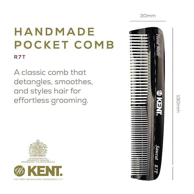 Kent R7T Graphite Fine Tooth and Wide Tooth Hair Comb - Handmade Pocket Comb for Men, Best Beard and Mustache Comb for Everyday Grooming, Sawcut made in England