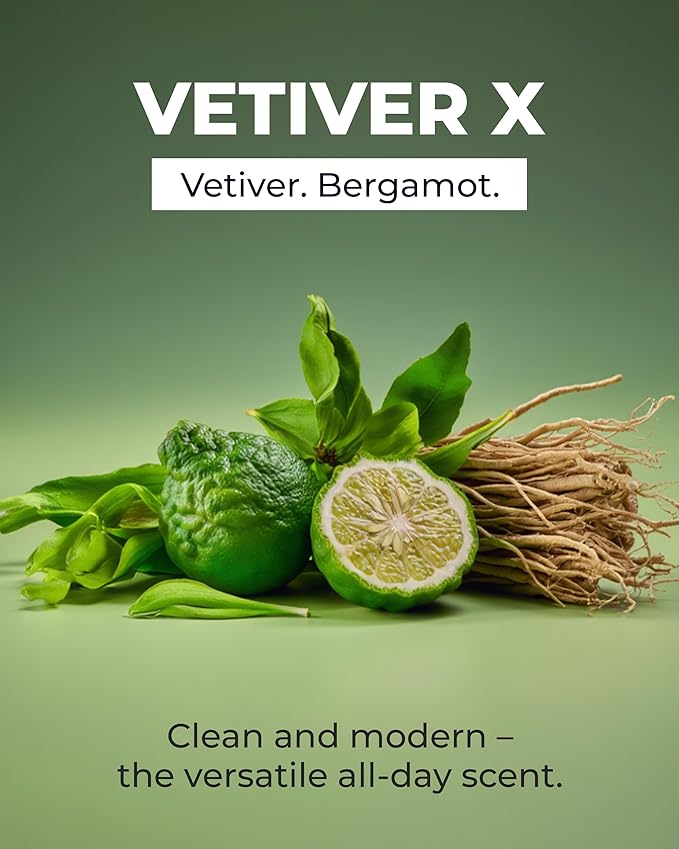 - Vetiver X: Vetiver and bergamot. Clean and modern – the versatile all-day scent.