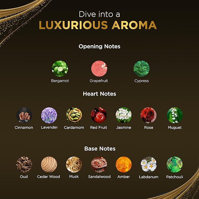 - Rich Masculine Scent Profile: Features a captivating blend of bergamot, cardamom, cypress, jasmine, lavender, amber, sandalwood, dark wood, oud, and musk. Designed for confidence—from boardrooms to date nights