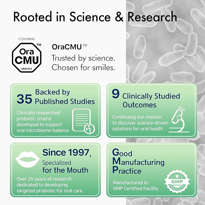 - PREMIUM DENTAL PROBIOTIC - Our patented oral probiotic strain oraCMU by Orapharm is the results of years of research and this clinically studied probiotic supports fresh breath, healthy teeth n gums, immunity.