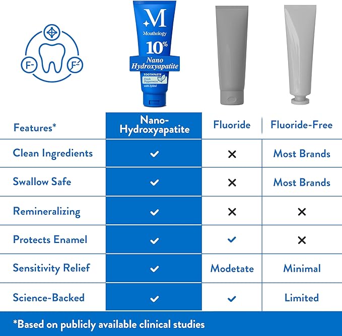 - FLUORIDE FREE & SAFE FOR ALL AGES: Our nano hydroxyapatite toothpaste is completely fluoride-free, offering a safe alternative for those looking to avoid the negative health concerns of fluoride. Our nHa toothpaste is made with biocompatible ingredients, safe if swallowed and recommended by dentists nation-wide.