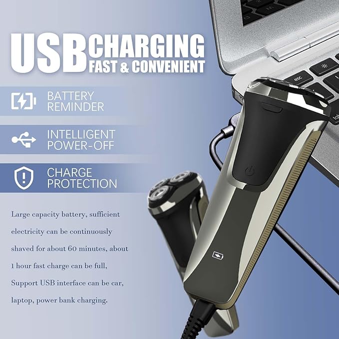 - [Fast & Convenient USB Charging] Charge on-the-go with the Electric Razor Pro of Father USB fast charging capability. Enjoy up to 99 minutes of shaving with just a quick 1.5-hour charge, making it ideal for busy professionals or travelers. Compatible with power banks, laptops, and car chargers for ultimate convenience