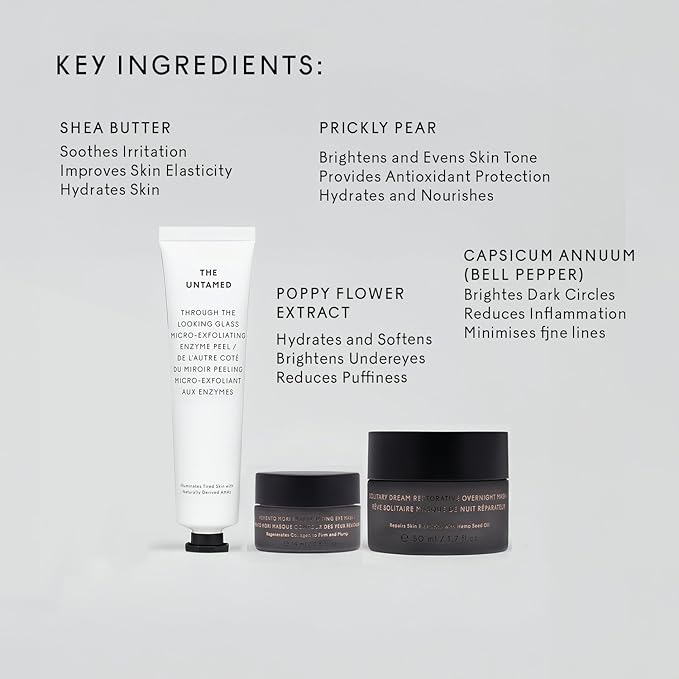 - SIMPLE SKINCARE ROUTINE - The Untamed Weekly Kit includes three essentials: Through the Looking Glass Micro-Exfoliating Enzyme Peel, Memento Mori Rejuvenating Eye Mask, and Solitary Dream Restorative Overnight Mask.