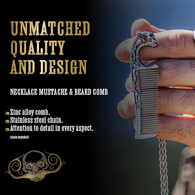 - Compact Necklace Comb for Mustache & Beard: A pocket-sized grooming essential for men, designed for on-the-go touch-ups. This portable, metal mustache comb easily fits into any grooming kit or pocket for travel convenience
